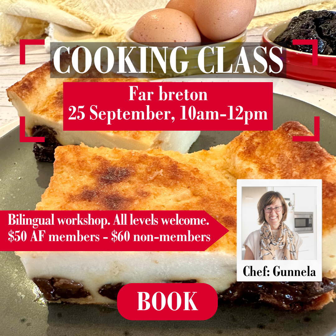 Join Gunnela in the kitchen at Alliance Française on Wednesday, September 25th, to master the art of baking Far Breton and impress your guests!