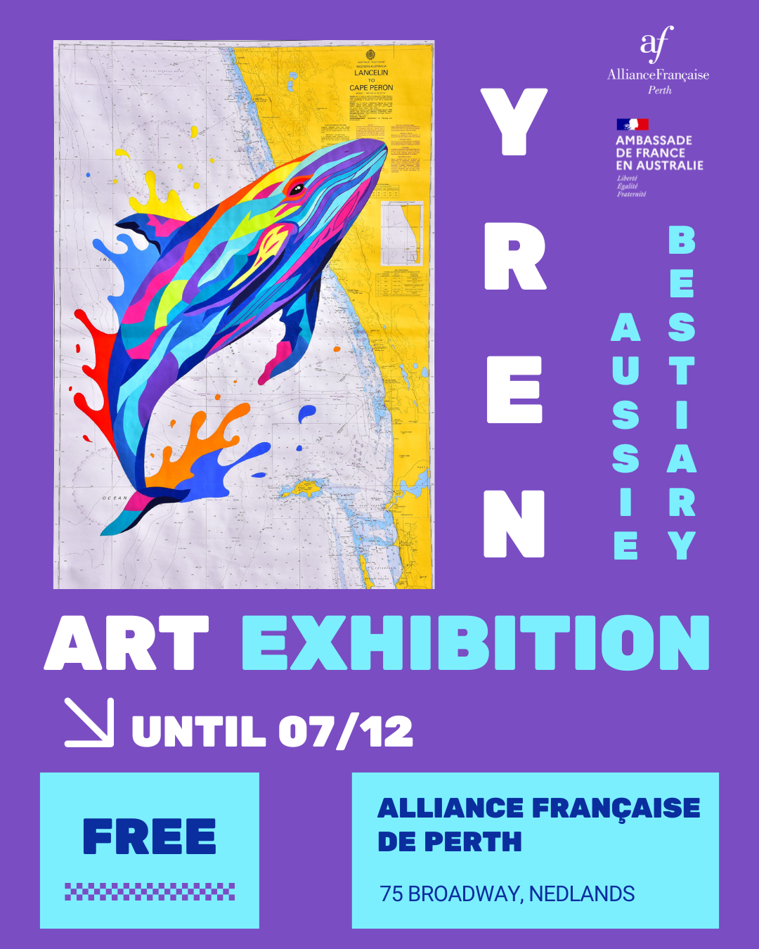 This new series, dedicated to the animals of Western Australia, was created exclusively for the Alliance Française de Perth. Yren offers a unique journey: portraits of iconic animals painted onto authentic nautical charts, where each creature naturally finds its place within the territory shown.