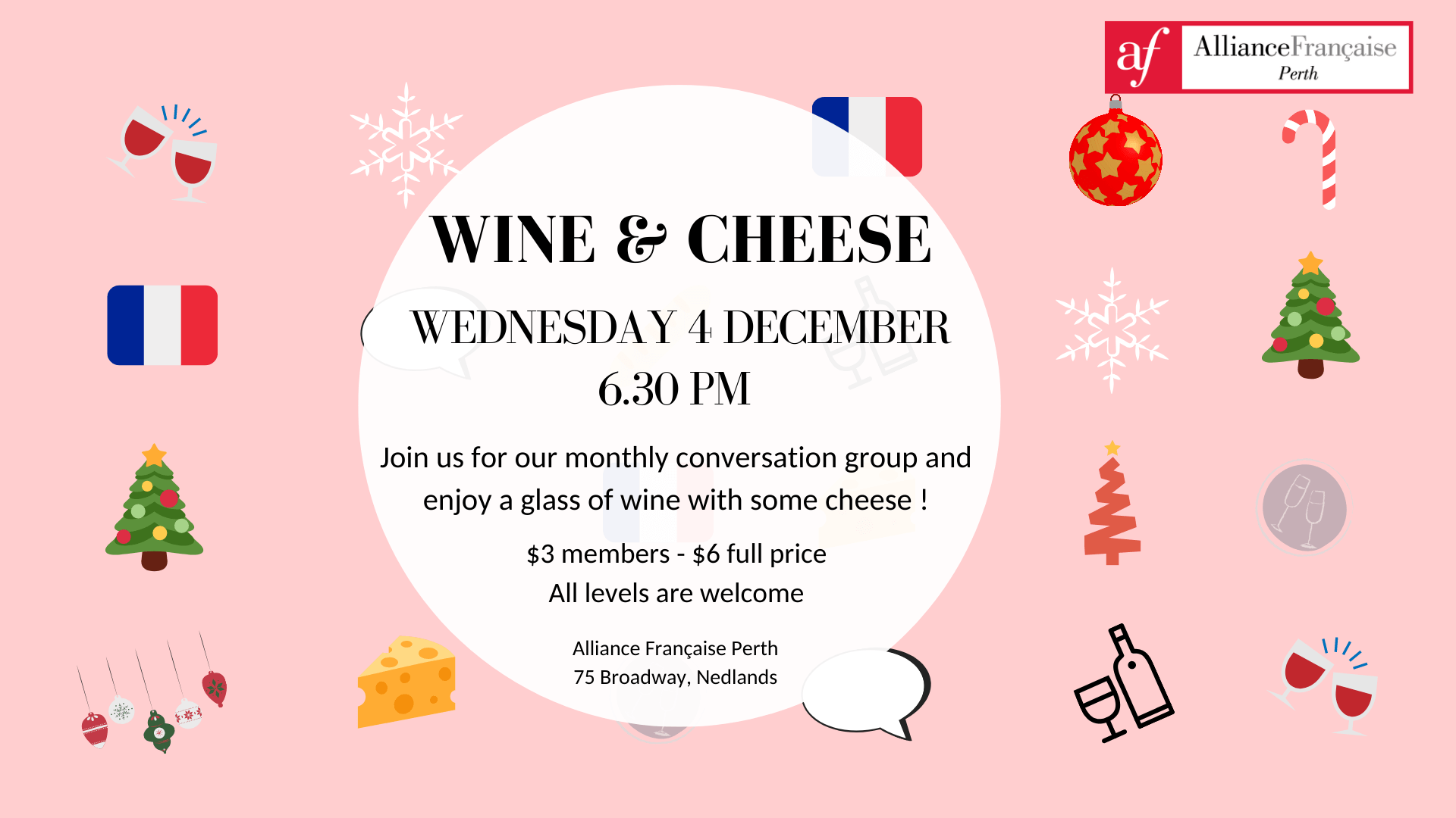 Join us for our monthly Wine and Cheese evening at the Alliance Française for this December edition!