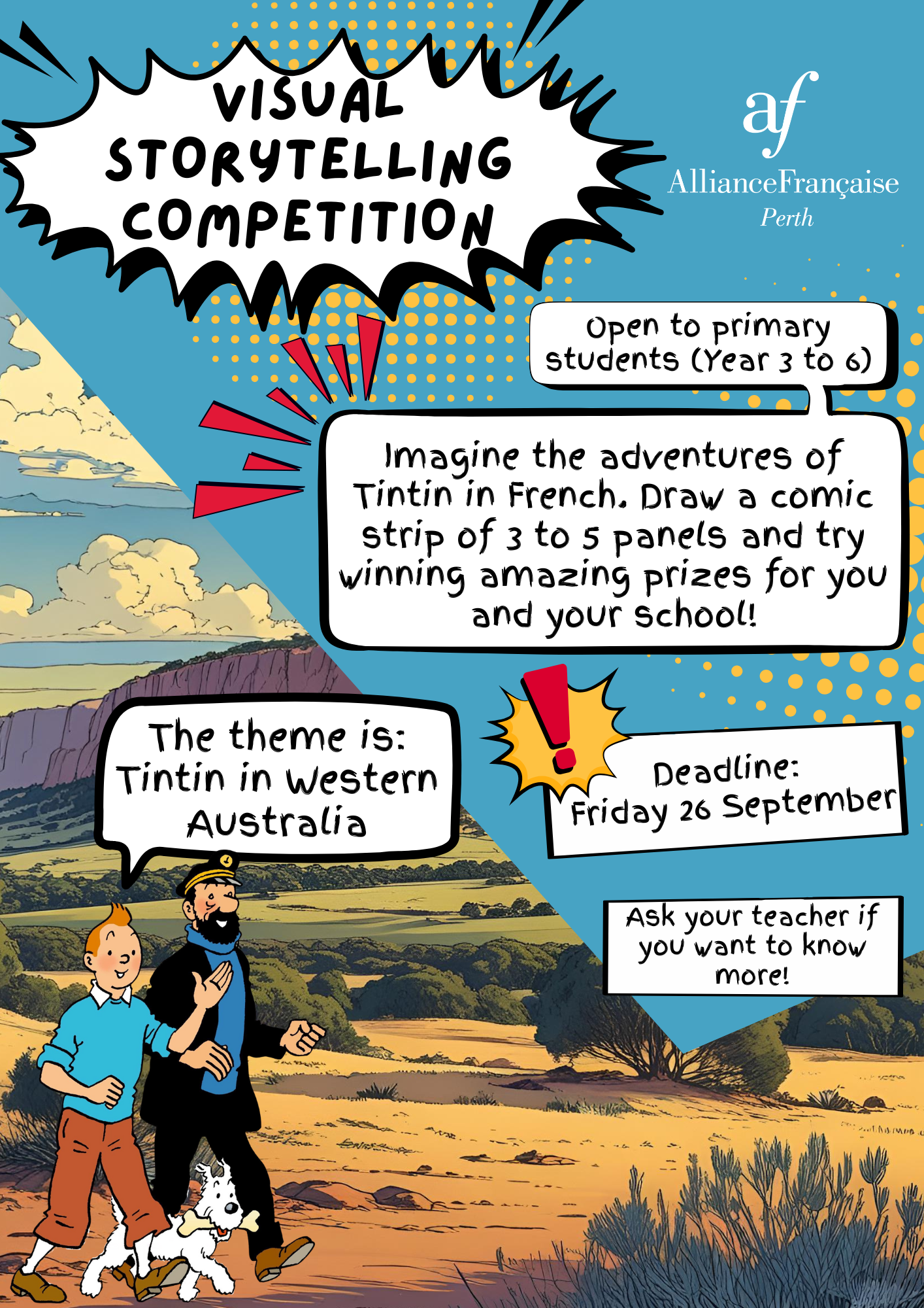 We are thrilled to share the inspiring results of our “Tintin in Western Australia” Visual Storytelling Competition! This creative challenge brought together more than 50 talented students from across various schools, each reimagining Tintin’s adventures through the unique landscapes of Western Australia. The imagination, skill, and storytelling shown in these works have truly impressed our judges and audience alike.